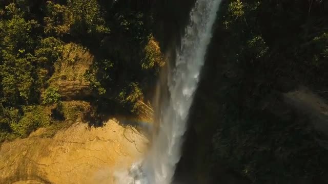Beautiful waterfall in green forest in jungle. Aerial view:tropical rainforest with waterfall. Waterfall with natural swimming pool in a mountain river canyon. Philippines, Bohol. 4K video. Travel concept. Aerial footage.