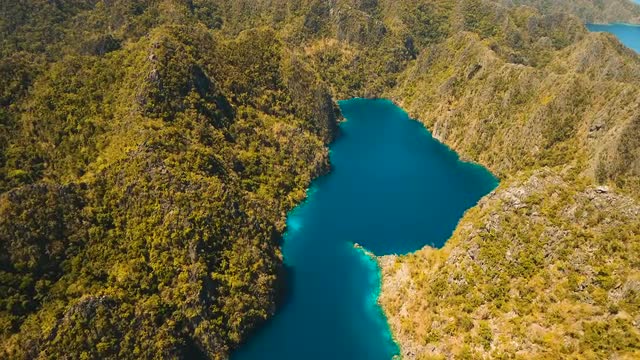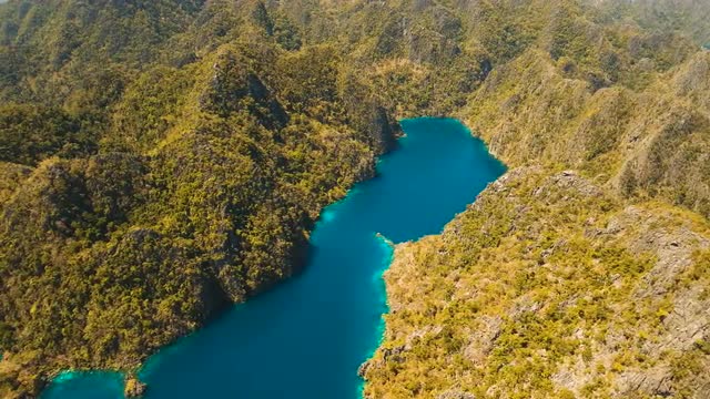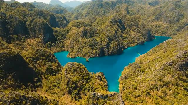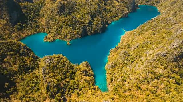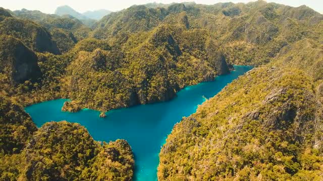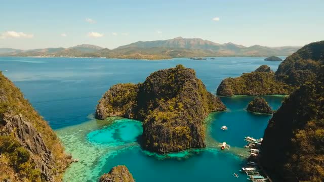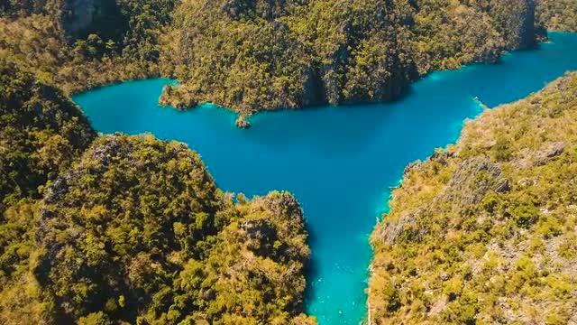 Tropical lagoon with azure water, beach by the Kayangan Lake, Philippines. Aerial view Coron island, with cove, bay at Kayangan lake. Lagoon with sailing boats. Aerial video. Philippines. 4K video, Travel concept, Aerial footage.