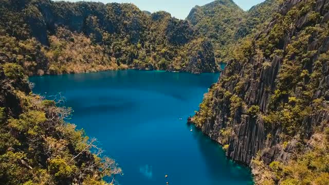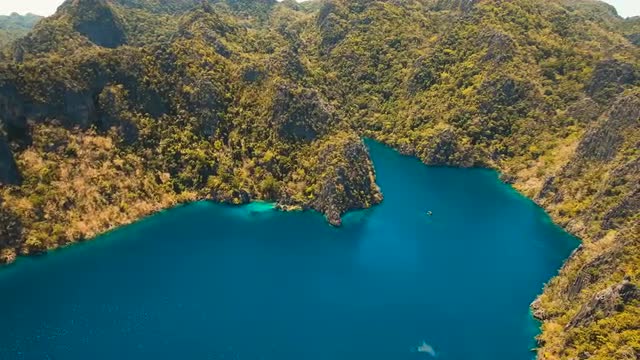 Tropical lagoon with azure water, beach by the Kayangan Lake, Philippines. Aerial view Coron island, with cove, bay at Kayangan lake. Lagoon with sailing boats. Aerial video. Philippines. 4K video, Travel concept, Aerial footage.