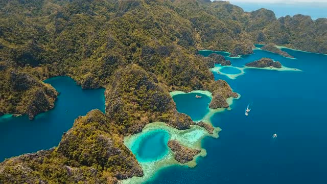 Aerial view: Mountain Barracuda lake, on tropical island, Lagoon with blue, azure water. Lake in the mountains covered with tropical forest on the island Coron, Palawan, Philippines. 4K video, Travel concept, Aerial footage.