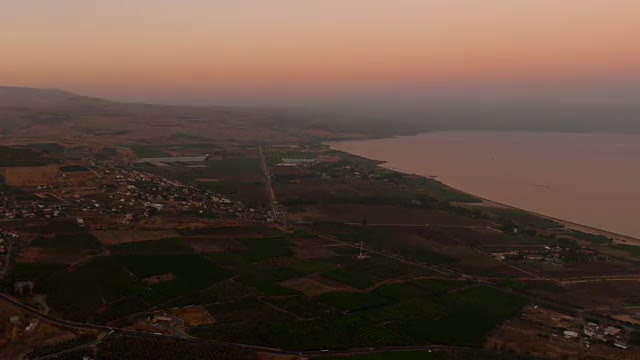 1001479 - Sunset aerial view flying backwards over pond and farm field