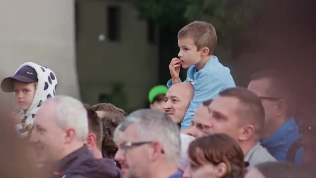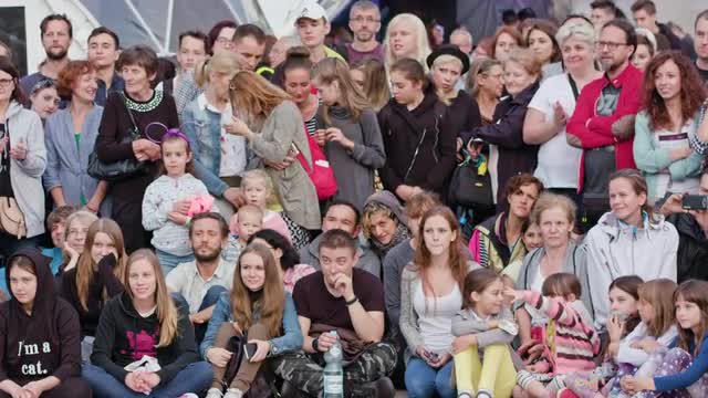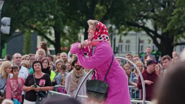Lublin, Poland - July 2017: Sari Makela Performes The Great Granny Show during Festival Sztukmistrzow. Crowd watches performance staying and sitting on the paving. Girls on trhe shoulder of their fathers. Sunny. Afternoon. Medium. Stabilized
