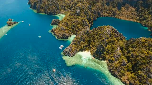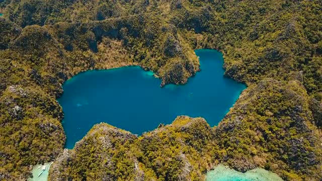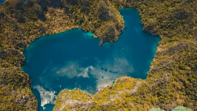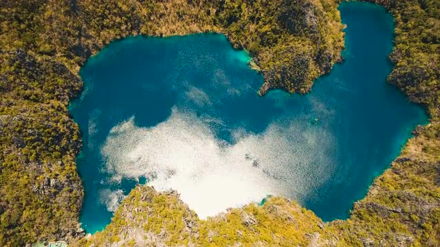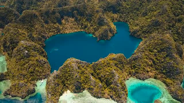 Aerial view: Mountain Barracuda lake, on tropical island, Lagoon with blue, azure water. Lake in the mountains covered with tropical forest on the island Coron, Palawan, Philippines. 4K video, Travel concept, Aerial footage.