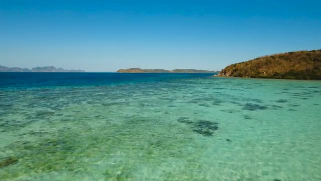 Flying over the blue sea in the azure lagoon. Aerial view: water surface. Tropical sea. Philippines. Flying over the azure surface of the ocean. 4K video. Travel concept. Aerial footage.