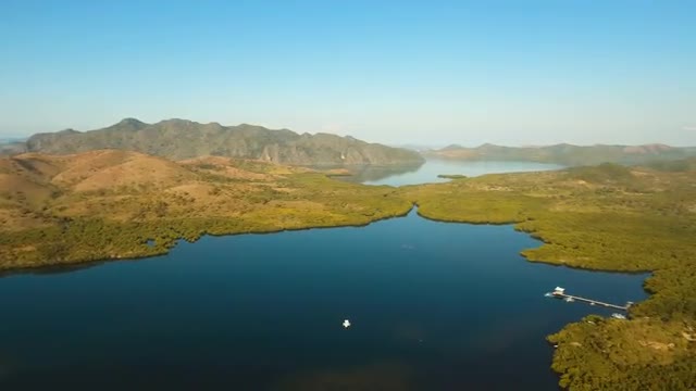 Tropical landscape, at sunrise time with mountains, tropical forest, bay, mangrove forest. Aerial view Seashore with jungle. Coron, Philippines,Palawan, Busuanga. 4K video. Travel concept Aerial footage