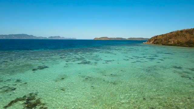 Flying over the blue sea in the azure lagoon. Aerial view: water surface. Tropical sea. Philippines. Flying over the azure surface of the ocean. 4K video. Travel concept. Aerial footage.