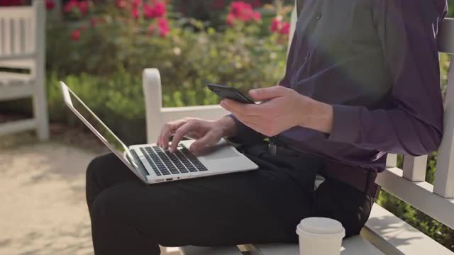 A young man finishing work and drinking a milkshake in the park. Medium shot. Soft Focus