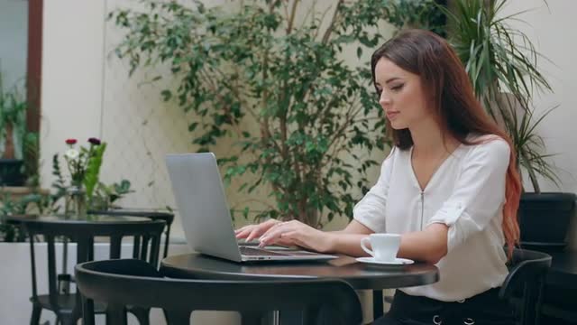 A beautiful girl sitting at the table in the pub and using her laptop. Medium shot. Soft focus.