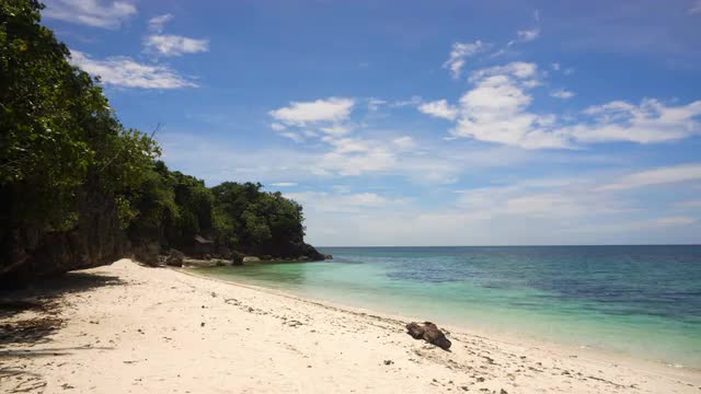 Tropical beach with white sand with beach house on a tropical island Bohol . Beautiful sky, sea. Seascape: Ocean and beautiful beach paradise. Philippines. 4K video. Travel concept.