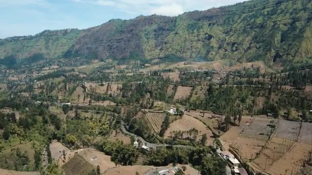 Valley in the mountains, farmlands of the land, a village with farmlands on the slopes of the mountains. Aerial view of Mountains are covered with forest. Jawa island, Indonesia. 4K video. Aerial footage.