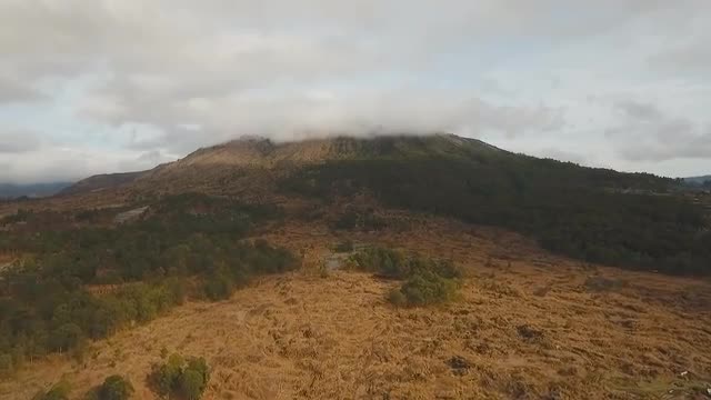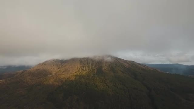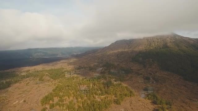 Lake Batur in the crater of a volcano. Aerial view of volcano mount and lake Batur located in Kintamani area in Bali, Indonesia. Landscape, lake, mountains, clouds. 4K video. Travel concept. Aerial footage.