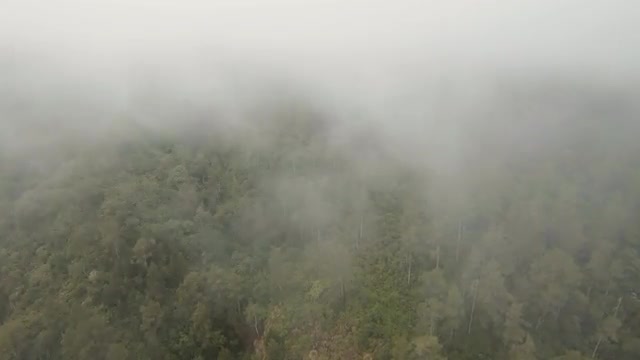 Mountain forest in the fog and clouds. Aerial view of over tropical rainforest mountains with white fog, clouds Bali, Indonesia. Low lying cloud over evergreen forests. 4K Aerial footage.