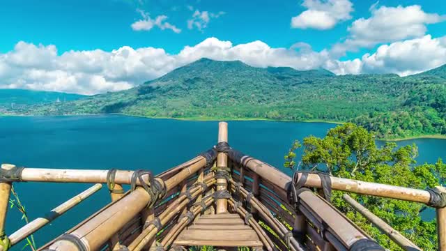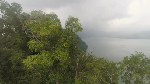 Aerial view of under the clouds, to the mountains and the lake. Lake Buyan,caldera lake at Bali. Landscape, lake among mountains, sky, clouds. 4K video. Aerial footage.