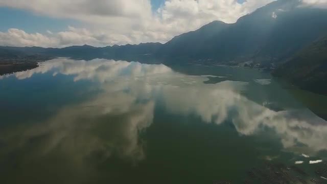 Aerial view Lake among the mountains with reflection on the surface of the blue sky and clouds, Bali, Indonesia. Mountain landscape with volcanoes, lake, sky and clouds. 4K video. Travel concept Aerial footage