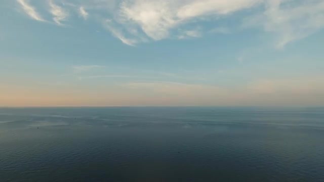 Aerial view: Sea water surface at sunset. Flying over the blue ocean with blue water, sky. Bali,Indonesia.4K video. Travel concept. Aerial footage