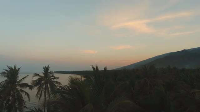 Sunset, silhouette of palm trees. Aerial view of sunset on the ocean coast, mountains, sea, beach, sky, clouds Bali, Indonesia Aerial footage