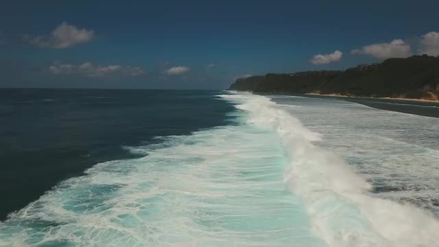 Aerial view of rocky coast, tropical beach with large wave. Large waves of turquoise water crushing on a beach Melasti, Bali,Indonesia. Travel concept. Aerial footage