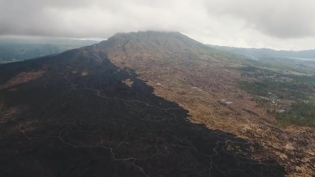 Mountain landscape with volcano, traces of lava on the ground, sky with clouds. Aerial view of Mount Batur Volcano in Kintamani. Bali volcano, also referred to as Kintamani is popular sightseeing destination in Bali. Travel concept. Aerial footage.