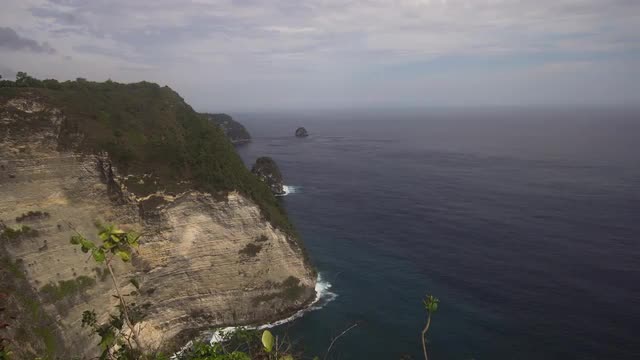 Cliff with waves crashing against rocky shore, Nusa Penida, Indonesia. Rocky coast and ocean with waves and rocky cliff. 4K video. Travel concept.