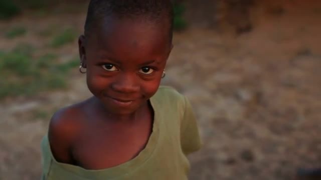 > Kenyan girl with large shirt looking at the camera.