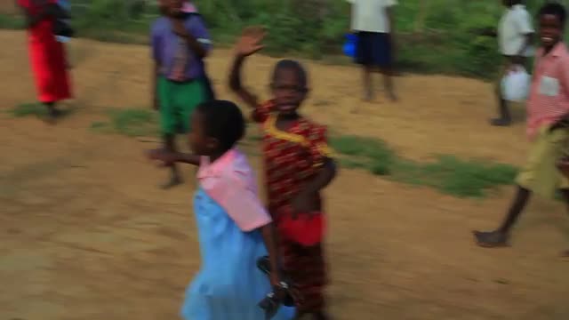 Children run alongside a car in Kenya, Africa.