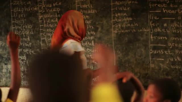 > Schoolteacher in a full classroom in Kenya.