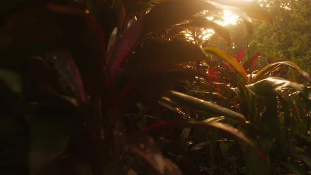 Slow track of forest leaves. The sun occasionally peeks through, creating lens flare. Filmed in Kenya, Africa.