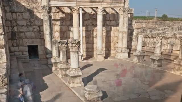 Panning shot of Dolly time-lapse of tourists at the old synagogue in Capernuam, Israel