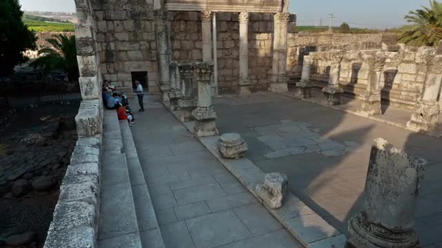 Time lapse of tour groups sitting and moving around synagogue ruins