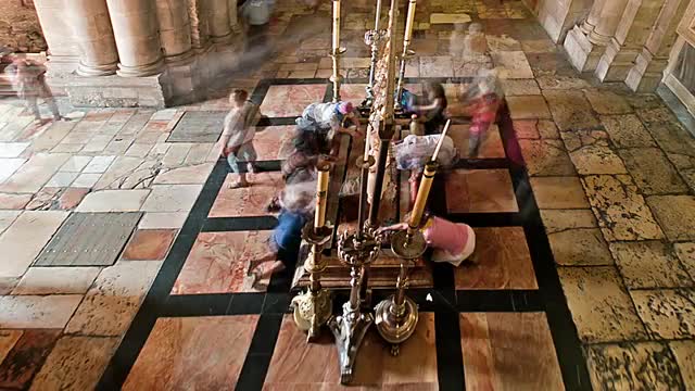 Tracking time lapse of Chapel of Derision within the Church of the Holy Sepulchre in Jerusalem, Israel. Focus on the altar containing part of a stone pillar.