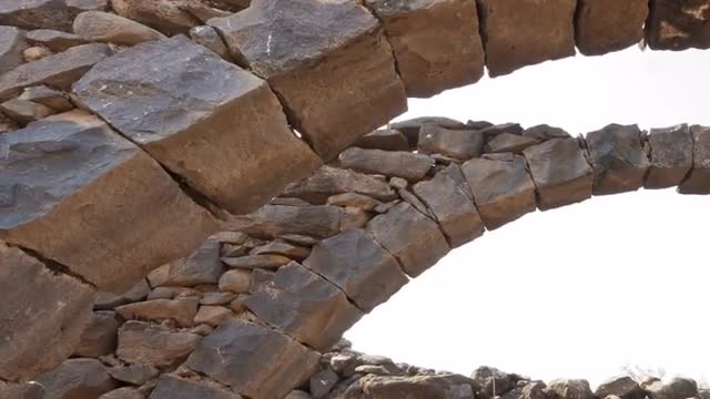 Tracking time lapse under stone arches. The arches are the only remaining standing structures amongst open-air rubble. Filmed in Korazim, Israel. Cropped.