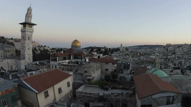 Panning shot of Tracking time-lapse of Jerusalem and the Dome of the Rock at dusk.