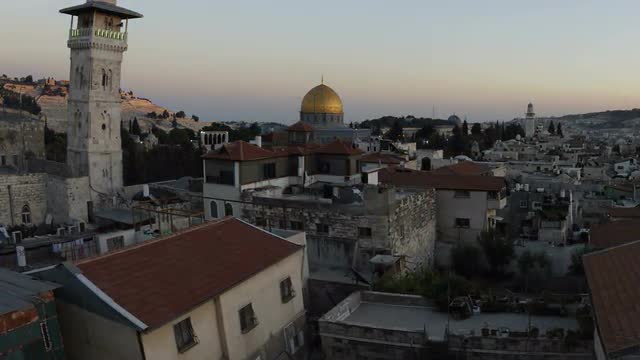 > Tracking time-lapse of Jerusalem and the Dome of the Rock at sunset. Cropped.