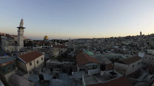 > Tracking time-lapse of Jerusalem and the Dome of the Rock at sunset.