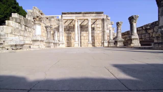 Slow-moving tracking of ancient Capernaum synagogue courtyard, with pillars around the edge.