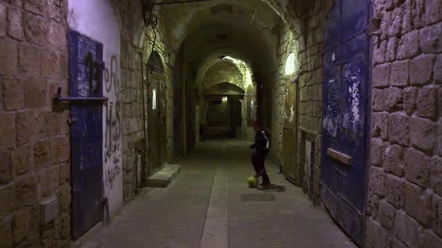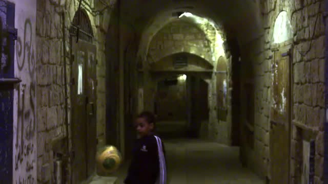 > Stock Video Footage of a boy playing soccer in an ancient alley filmed in Israel at 4k with Red.