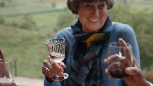 > Elderly woman pouring wine for her friends while they talk at a party