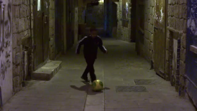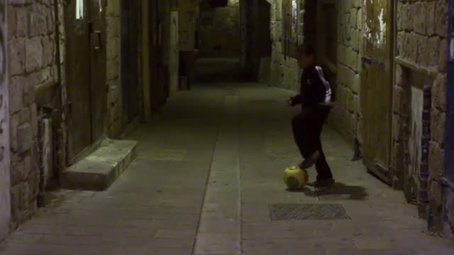 A boy playing soccer in an ancient alley filmed in Israel.