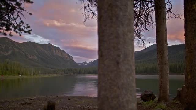 615422 - Landscape Swamp Forest Lake Sunset Pink Reflection in the Sky High Green Grass Field Smooth Water in