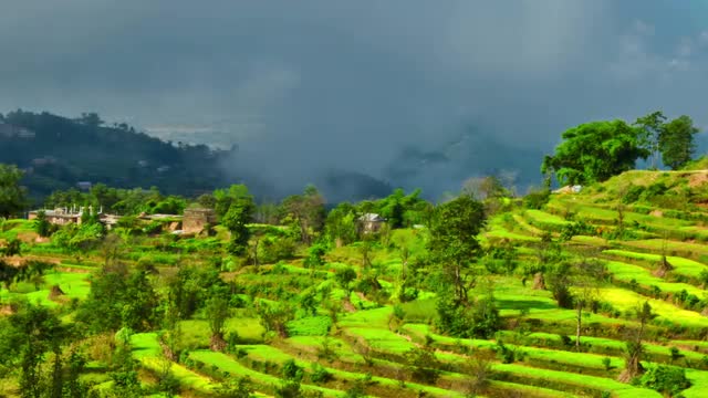 Time-lapse of a terraced, cultivated hillside in Nepal. The light on the green landscape shifts as the clouds move close-by overhead. Cropped.