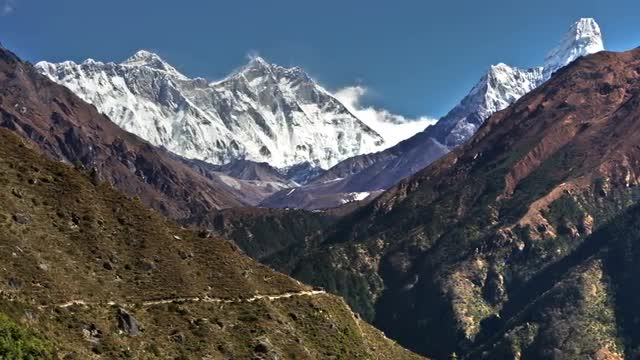 Time-lapse of people walking along a mountainside trail in Nepal. Mount Everest, Lhotse, Nuptse, and Ama Dablam are in the background.