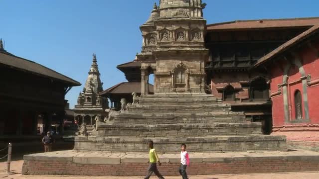 88118 - Young Nepali children walking past an old temple.