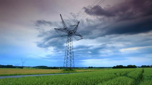 Tracking shot of an electricity tower along a road in the countryside. Filmed in Denmark.