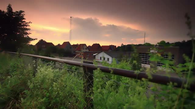 Dolly shot of a small town, taken over higher ground. Filmed in Denmark.