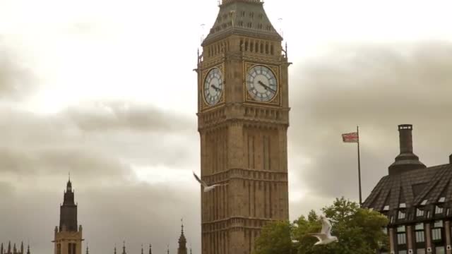 Big Ben with birds flying in front of camera in London, England. Filmed on October 11, 2011.
