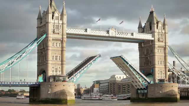 Bascules raise on Tower Bridge in London, England. Filmed on October 11, 2011.