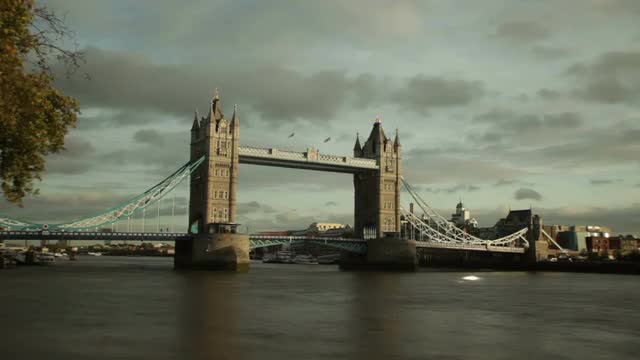 Distant view time lapse of Tower Bridge on Thames River in London, England. Filmed on October 11, 2011.