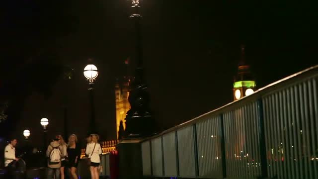 People getting their picture taken as the camera takes a shot of Westminster and Big Ben in London, England. Filmed on October 6, 2011.