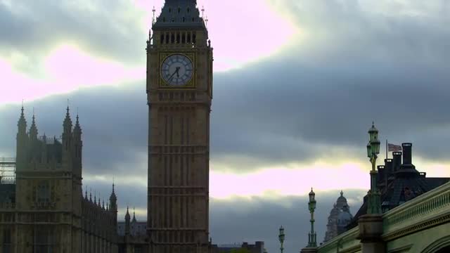 The camera moves gradually upwards on the Big Ben clock tower in London. Bits of Westminster Palace and bridge also visible. It is afternoon (5:38 PM) and there are some clouds in the sky. Filmed on October 9, 2011.