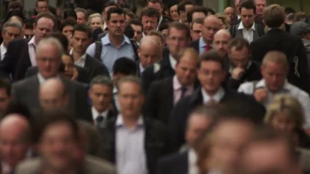 Stationary view of crowded London Bridge at rush-hour when people are commuting home from work. The closer to camera, the blurrier the people. Filmed on an overcast autumn day of October 10, 2011.